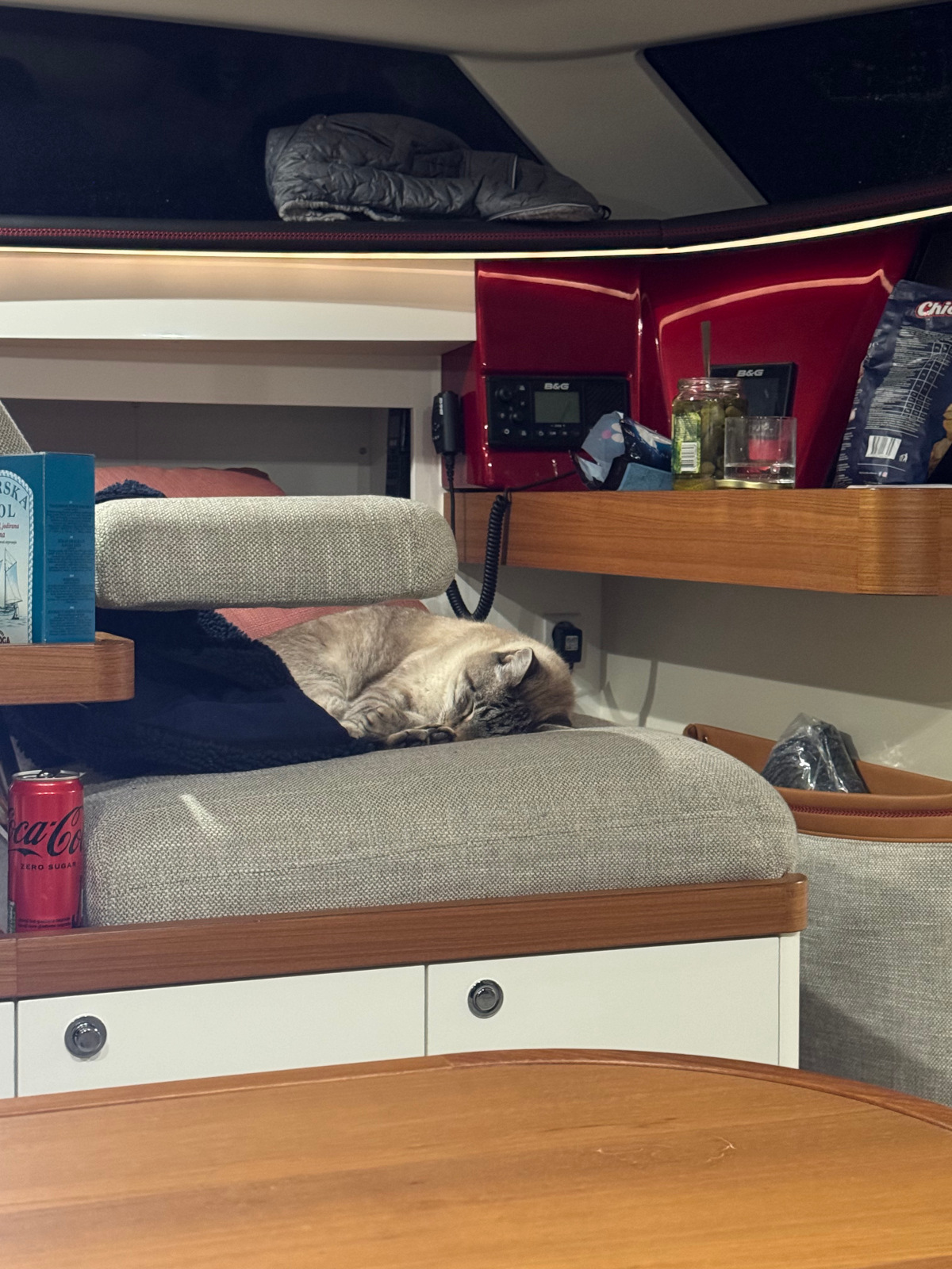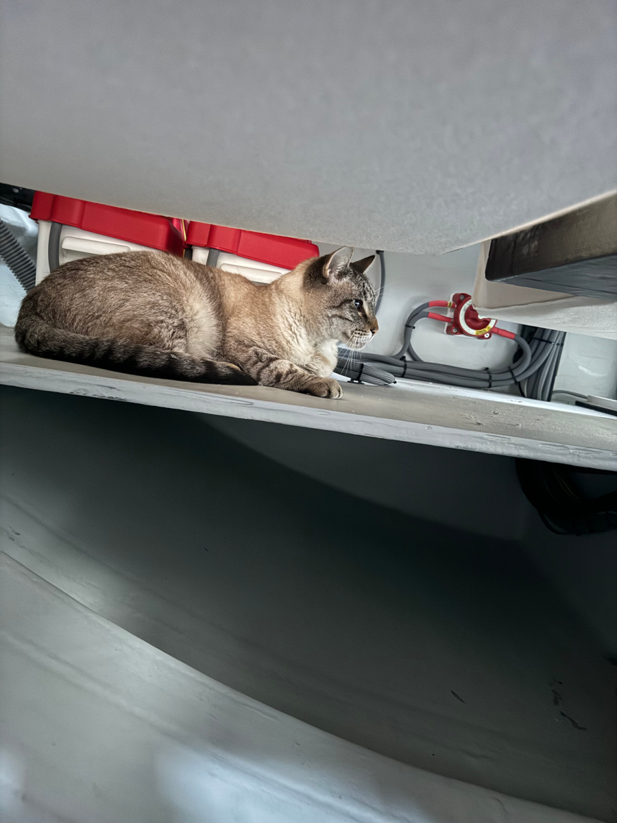 Other than the hot water thing, living aboard again is so great. The salon is big and full of light, and we're all in here without being on top of each other during the rainy days. The cat has find a way to squirm under the salon table, and he has himself a little spot that floats him above strands of cabling. We'll have to put a blanket in that spot for him on Velvet Elvis.