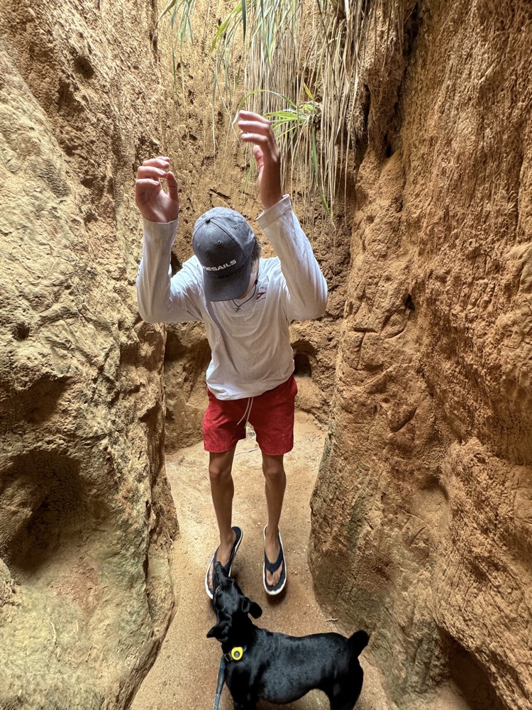 Playing in the crevasses in a red rock formation by the sea.