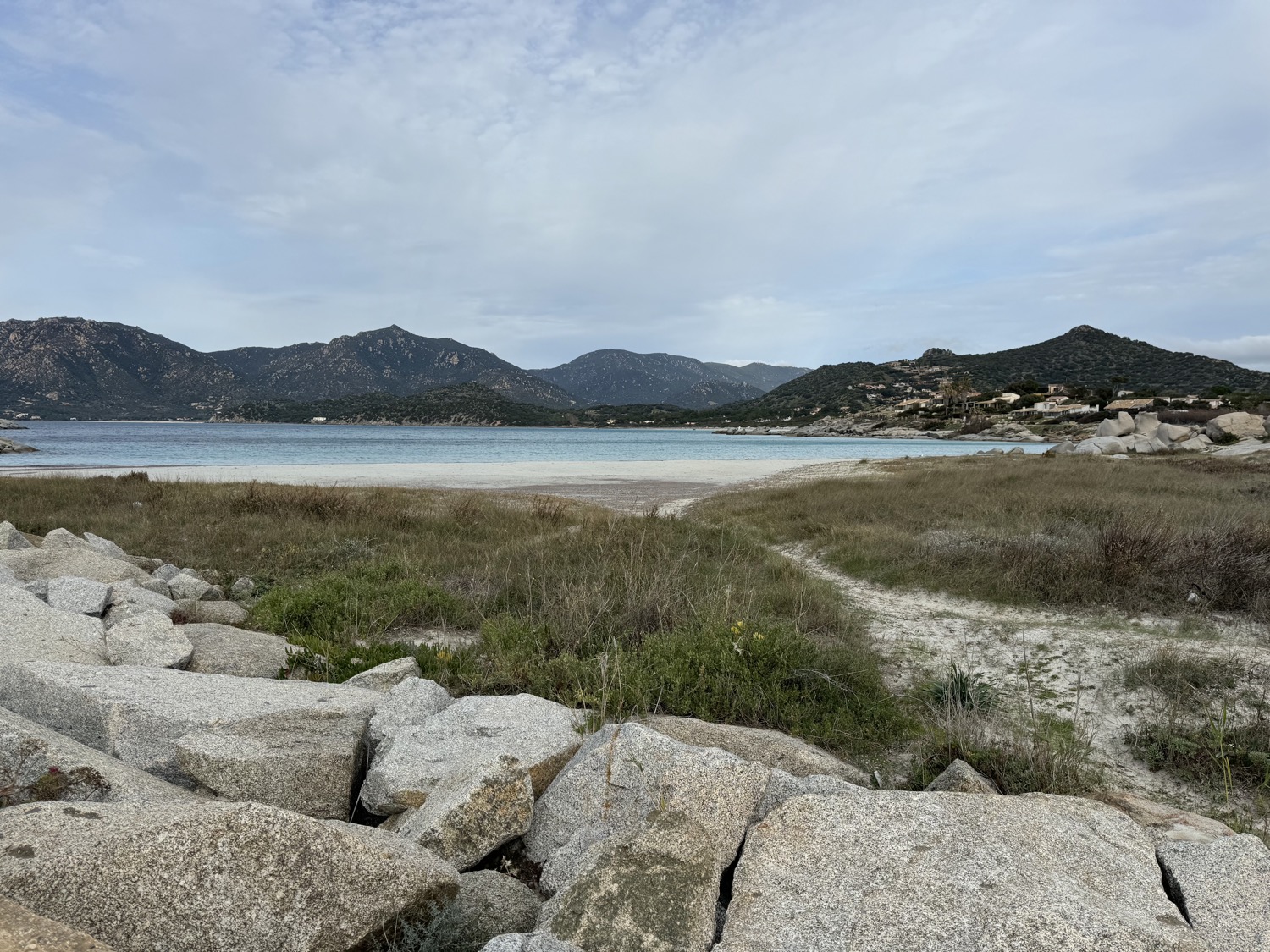 The line got caught in the prop (of course), which means no more motoring. We dropped the big sail to the deck and bungeed it into an ugly bundle. Then, under main sail alone, we sailed close to a pretty little beach and dropped anchor.