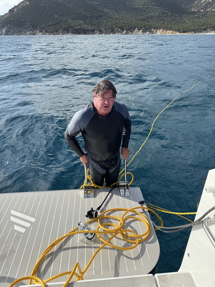 The line wasn't on tight. I just had to unwrap it, maybe seven or eight times. I wasn't under the boat more than 75 seconds or so, probably, but I was nervous like I was diving a blue hole.