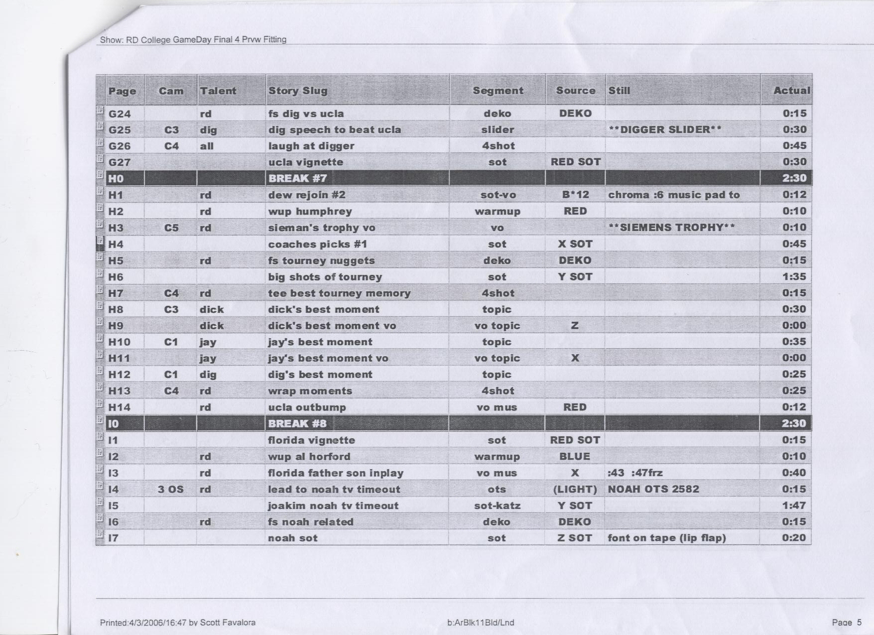 At Champps dishes do not get washedAppetites quashed, we left during the first half, and walked up to the ESPN set to lookey-loo. Surprisingly, the set was just sitting there empty, and we were able to wander around without anyone saying anything about it. We didn't actually go sit at the desk or anything, but I did steal a copy of their plan for the pre game. You can click on the image to see a bigger copy.
