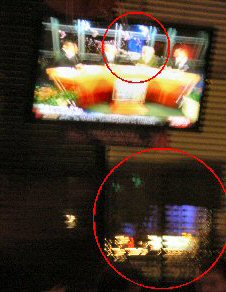 The building with the purple light is visible in this blurry photo on both the ESPN broadcast and out of the window.