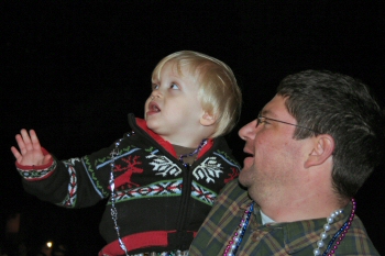 As the parades dragged on and on, he fought sleep, finally dozing on my shoulder one float before Mrs. theskinnyonbenny's. By now, it was somewhere around midnight. But something woke him, and he and Mom got to see each other from float to sideline. He nodded when asked if he saw Mama, but it's hard to imagine he recognized which one was really her in wig and mask. Maybe. We could hear her voice for sure, so he probably really knew she was up there.