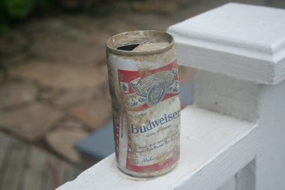 The dog dragged up this beer can from under the house. Based on the look of the can, and on the pop-top, I suspect it's been under there since our house was moved to its current location in 1980.