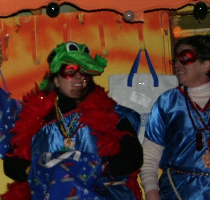 This is Stacie and Mrs. theskinnyonbenny on their float in the Muses parade. It's the only photograph I got of them, and admittedly, it's a poor one. They weren't exactly where I thought they would be on this float, and from the street, I couldn't tell who was who under those alligator heads.