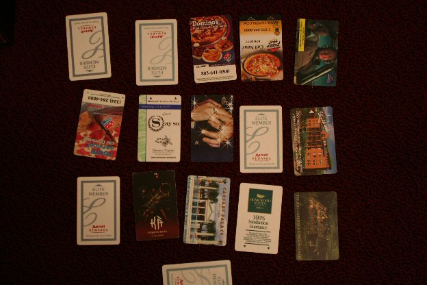These are all of my hotel room keys from 2006. It's an interesting collection. There are the pizza advertisement ones -- mainly from my two road trips to North Carolina. Then, there is an abundance of the fancy hotel ones with pretty pictures. Finally, there are a bunch of plain Mariott keys from work trips.