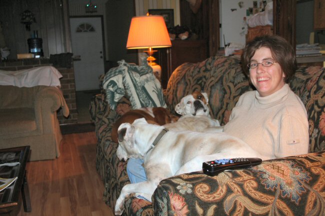 Scenes from Thanksgiving #3: Two spoiled farm dogs, a farm-dog wannabe, and Mrs. theskinnyonbenny watch TV.