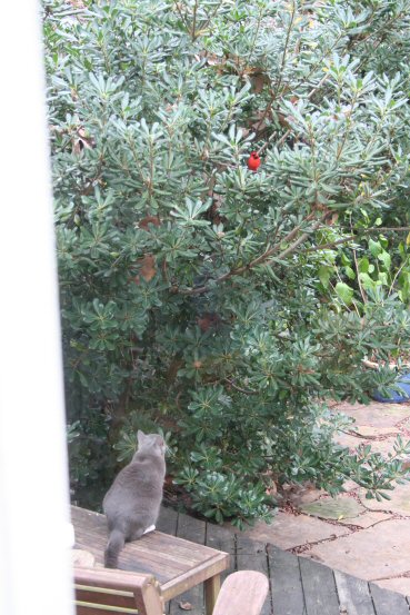 I recently caught Bubbles hunting the brightest Cardinal that I've seen in a long time.