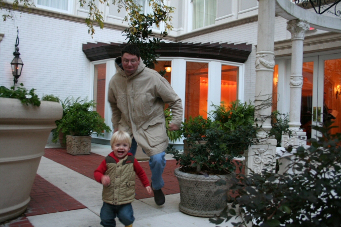 Playing chase in the courtyard.