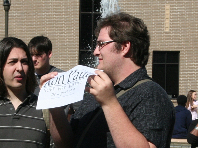 There were a couple of other odd things at the Clinton visit. Here's a lone Ron Paul supporter, whose sign appears to just be a photocopy of something real.