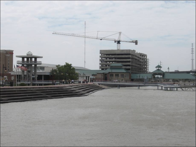 If you aren't familiar with the BR riverfront, the normal look of this is that the stairs go down about 30 feet or so, then there's a muddy bank, and then there's the river. You can typically drive under that walkway that you see here, even off to the right of this photograph.