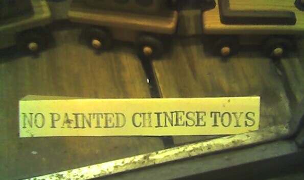 I got a few pictures from a toy store window in New Orleans this weekend. Here, you can buy Chinese toys, or you can buy painted toys. But you can't get a toy that is both Chinese and painted.