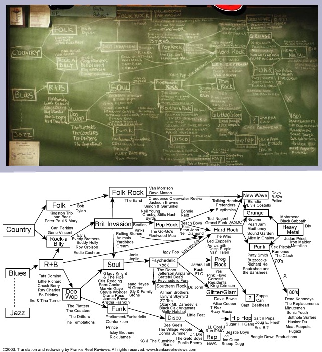 In the movie School of Rock, Jack Black draws this chalkboard full of Rock Genres and relationships. Someone with too much time on their hand went through and figured out what the drawing said, and put it together in the lower graphic here. I thought it was a neato chart.