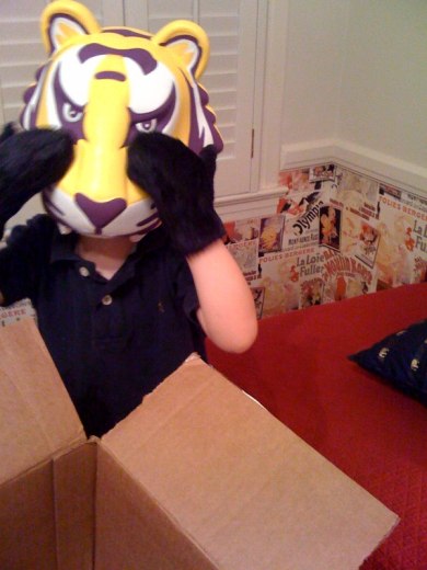 Birthday presents from Aunt Shelly: A foam tiger hat, and new mittens (worn to school with shorts and t-shirt the next day).