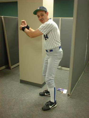 I don't know what the occasion was, but this is a years-old photo of a guy I know named Steve Brunet, posed in a baseball getup, at work.