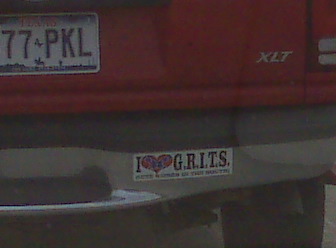 As a counterpoint to weirdos from New York, here's one that Stacie sent from Texas. "Not sure if you can read this bumper sticker, but is says 'I love G.R.I.T.S' which stands for Guys Raised In The South. And of course the 'heart' is styled as a rebel flag. I'll bet Shelly doesn't see much of that in NY!" I think Texas weirdos might be funnier than New York ones.