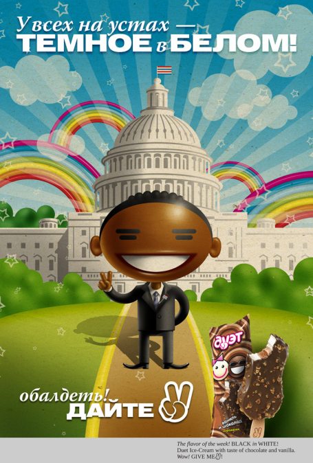 Perhaps my most difficult to believe pic of the day. In Russia, the election of a black president reminds some Madison Avenue of Moscow Type of the ice cream account that he'd been working on. The translation is small, at the bottom. (From englishrussia.com).