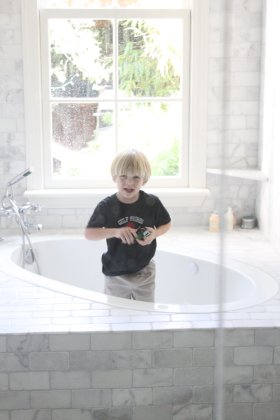 Playing in our new bathtub.
