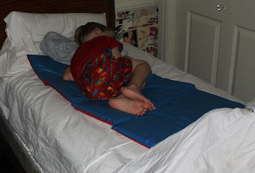 At the end of the school year, I brought home the nap mat from Vanya's school. For some reason, he takes it from room to room, and sets it up to sleep on in bed every night.