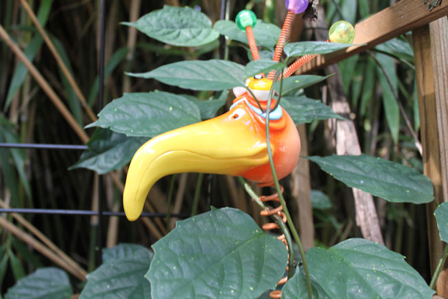 For Mrs. theskinnyonbenny's birthday, I took Vanya to a store and let him pick out a present he thought she would like. He picked this bird, which now decorates one of our beds in the back yard.