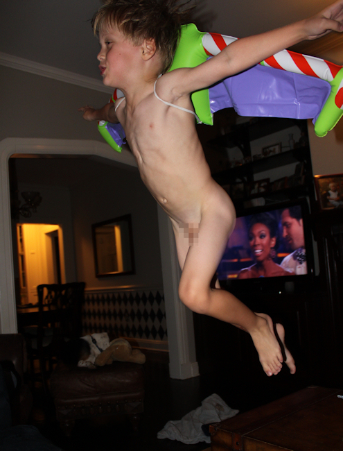 You know that on his own planet, the real Buzz Lightyear has a few too many beers from time to time, strips off all his clothes, and throws on the jetpack for a naked jaunt around the stratosphere. I like that the real dog and the stuffed dog in the background have their heads turned in modesty.