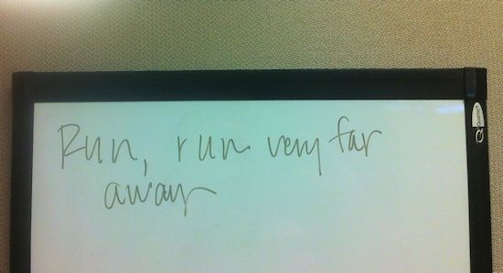 Found, on the whiteboard, on an abandoned desk that I decided to occupy at a client's site last week.