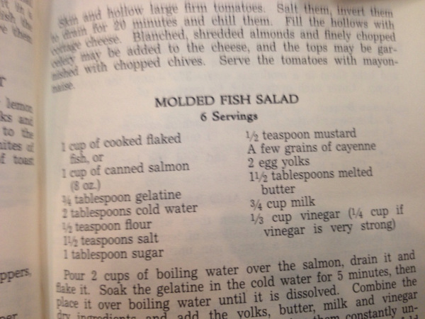 Does molded fish salad sound good? It was better than you might expect: a nice fish stew, with gelet1n added, put into a mold, and served cold.