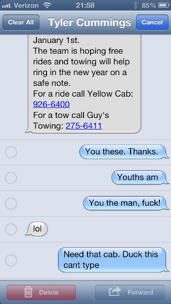One night over the holidays, Tyler came through with the phone number for a cab ride, on a night where that was clearly a good idea.