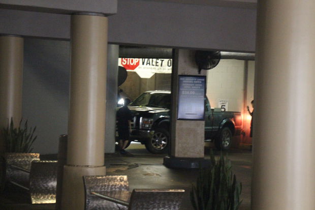 I had to wait a long time to get my Jeep from the valet, because they had this truck turned in there sideways, and had to execute a 73-point turn to get it out. How it ended up like that I can't imagine.