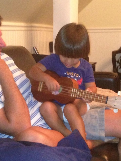 Strumming the ukelele and singing his tune.