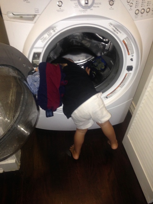 K helps move laundry from the washer to the dryer.