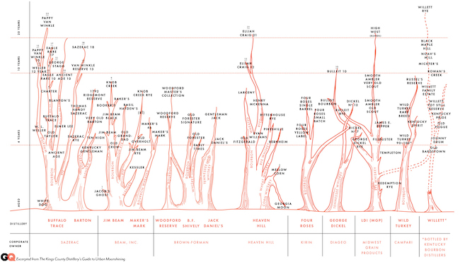 I pulled this cool graphic from gq.com. It's a tree showing what bourbons (and similar whiskeys) come from what. For example, your bottle of Knob Creek is just Old Crow that aged long enough to turn into Jim Beam, which aged long enough to turn into Knob Creek. The full sized graphic is here.