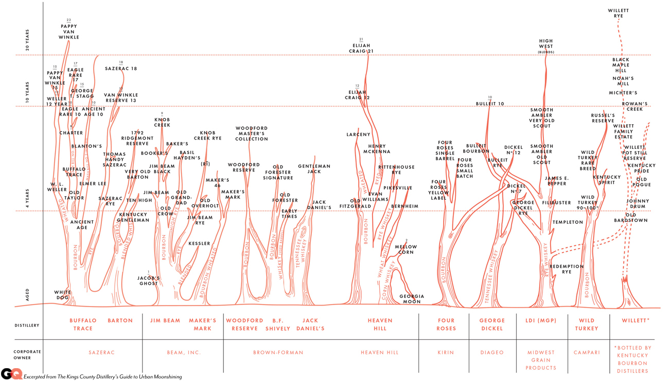 I pulled this cool graphic from gq.com. It's a tree showing what bourbons (and similar whiskeys) come from what. For example, your bottle of Knob Creek is just Old Crow that aged long enough to turn into Jim Beam, which aged long enough to turn into Knob Creek. The full sized graphic is here.