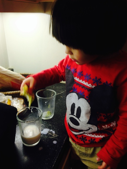 Kolya eats brussels sprouts wrapped in cheese and dipped in milk.