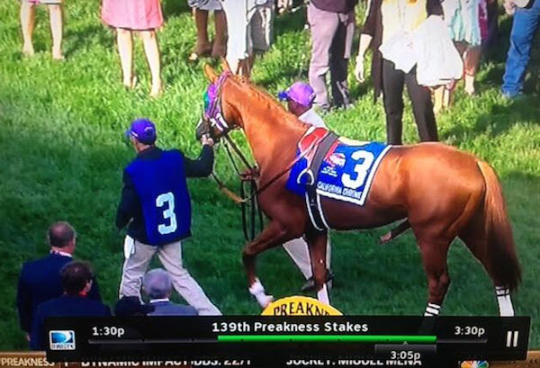 Hey California Chrome, is that a Louisville Slugger coming out of your abdomen, or do you just really, really love the post parade before a race?