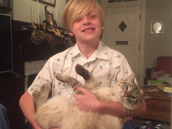 V had to make a poster about himself when he was student of the week at school. He wanted a shot with each of his pets. Here's one with Maks, whose as good a sport as any cat ever.
