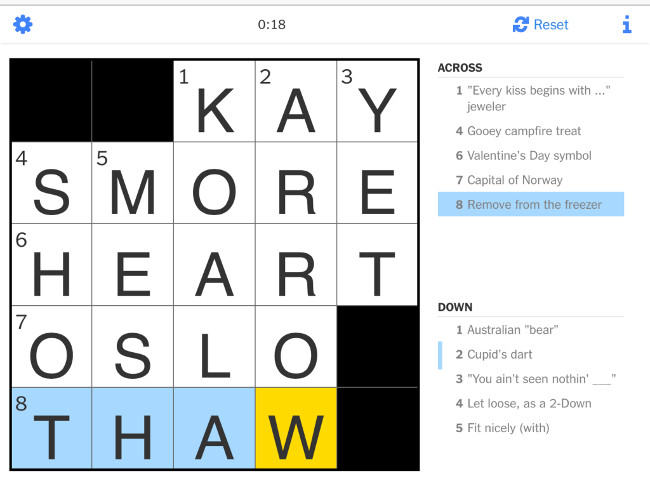 I like to do the mini crossword in the NY Times app every day. I try to finish in a minute or less, with mixed success. This is the easiest day ever, and I doubt I will ever beat my solve time of 18 seconds. It takes that long to type the letters.