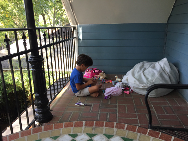 On an unusually quiet and sweet day, K joined me to play barbies on the balcony while I did work.