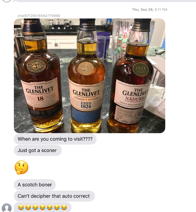 This one's a little hard to follow, since neither person texting is me, but it's basically Mrs. theskinnyonbenny trying to entice a visit from Shelly by showing her a (now disappeard) stash of scotch. Shelly is the one with a sconer.