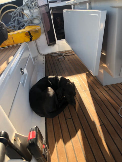 Cold dog on a winter sail.