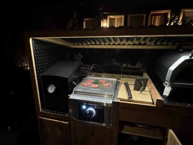 There's no counter top yet, but the new cook hut is mostly operational. It homes the griddle -- seen grilling burgers here -- the pizza oven, the fryer, and an ice maker.