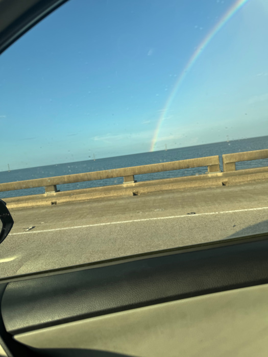 You can't really tell from this photo through a closed window, but this was one of the brightest rainbows that I've ever seen. It was while driving over the Pontchartrain spillway this week.