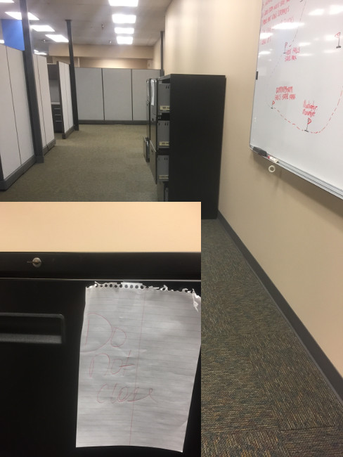 At one of the offices I visit for work, there are these filing cabinets, which have stood ajar for close to a year. Handwritten signs forbid closing them. I close inspection shows that the keys are in the locks. I can't figure out why they need to stay open. If I were an employee there, I would be bitchy about how trashy it all looks, but as a contractor, I don't feel like it represents me in any way.
