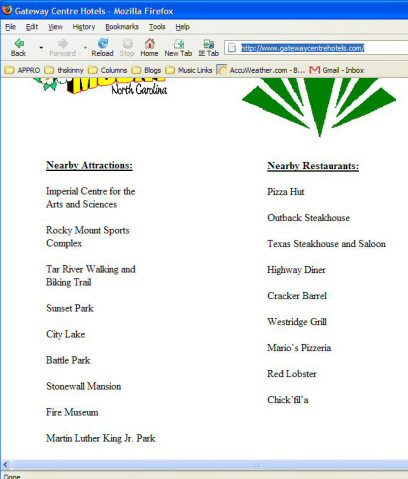 I'm posting this from a short work trip to North Carolina. I flew into Raleigh with Tyler (of sporadic haiku acclaim) and Ann, a sixty year old career woman whose energy and patience is double what we younger guys have. While we were walking out of the Raleigh airport, she's moving along at a good clip, toting what appears to be seventy-five pounds of luggage. We got to an intersection, and she asked, "You guys want to take a short cut out of here?"
