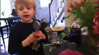 Vanya helps me pound round steak into a thin piece while doing Christmas cooking preparation.